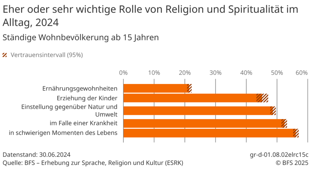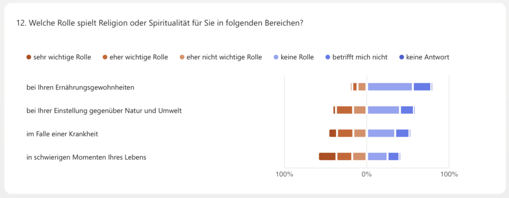 Im Vergleich mit den Zahlen des BFS geben die Teilnehmer*innen durchgehend eine tiefere Alltagsbedeutung von Religion oder Spiritualität an, allerdings ist Gewichtung ähnlich: Die Bedeutung von Religion oder Spiritualität für die Ernährungsgewohnheiten ist relativ gering, sie nimmt deutlich zu für die Einstellung gegenüber Natur und Umwelt, wächst weiter für Krankheit und erreicht ein relatives Maximum für schwierige Momente des Lebens.