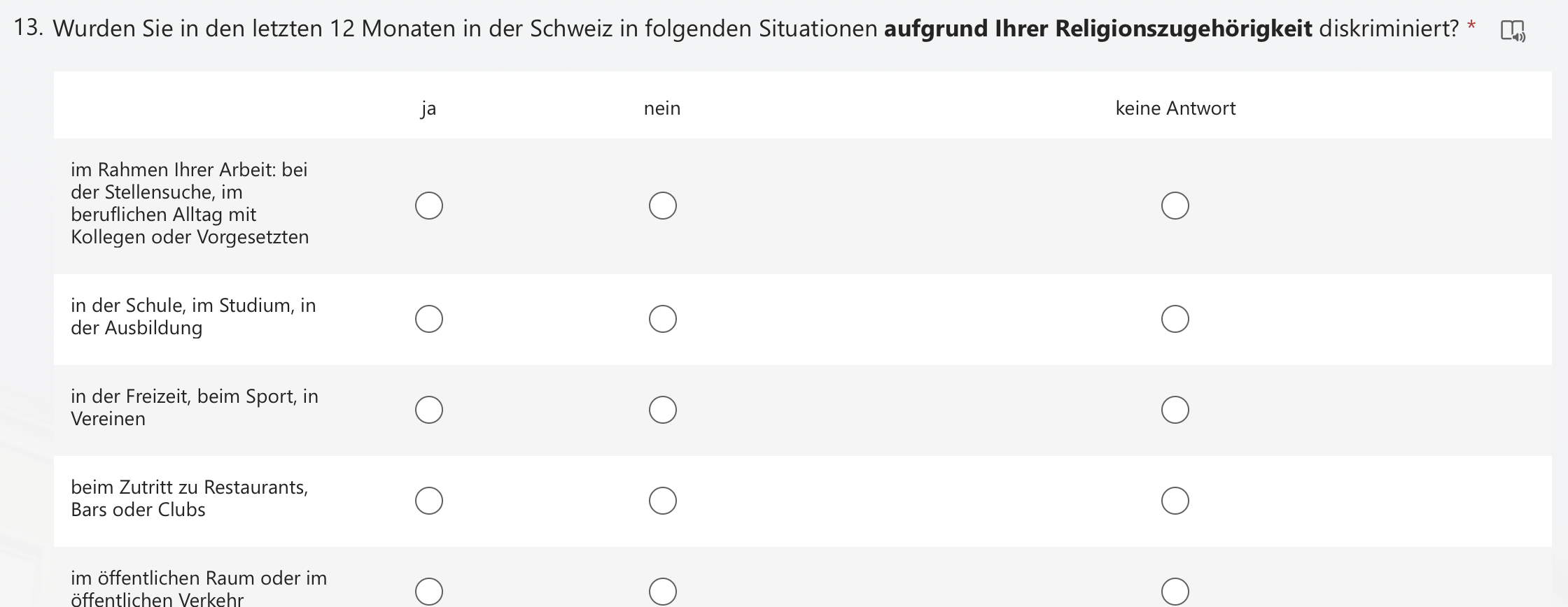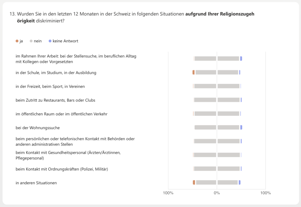 Zunächst ist festzuhalten, dass die grosse Mehrheit, nämlich 248 der 313 Teilnehmer*innen (79%) keinerlei religionsbedingte Diskriminierungserfahrung hat. Allerdings geben 40 Personen (13%) Diskriminierungserfahrungen auf Grund ihrer Religionszugehörigkeit an.