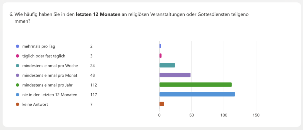 Von den 313 Teilnehmer*innen der Umfrage haben 117 in den letzten 12 Monaten an keiner religiösen Veranstaltung teilgenommen.