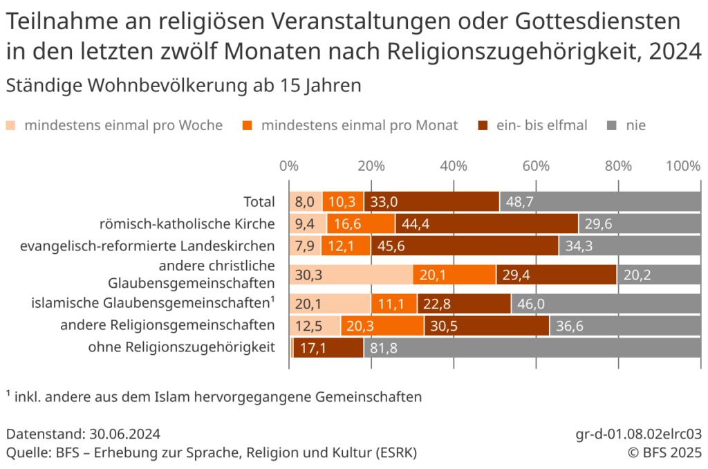 Im Vergleich mit den gesamtschweizerischen Zahlen ist die Teilnahme an religiösen Veranstaltungen damit eher hoch.