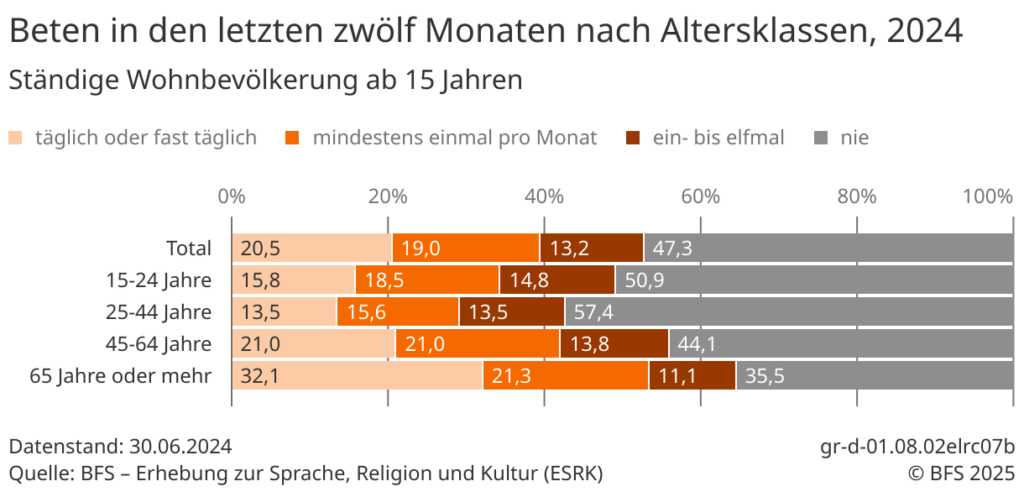 Im Vergleich mit den gesamtschweizerischen Zahlen derselben Altersgruppe ist die tägliche oder fast tägliche Gebetspraxis etwas höher, ansonsten durchgehend leicht tiefer.