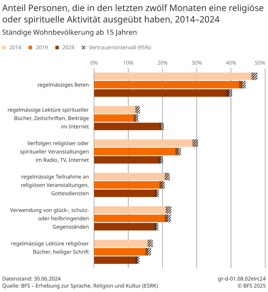 Im Vergleich mit den gesamtschweizerischen Zahlen des BFS sind in der Umfrage nur die Zahlen zum regelmässigen Beten etwas tiefer, betreffend regelmässiger Lektüre spiritueller Beiträge im Internet etwa vergleichbar und hinsichtlich aller anderen Praxen deutlich höher.