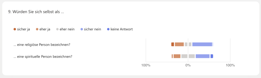 Betreffend der Frage nach Spiritualität antworten von den 313 Teilnehmer*innen der Umfrage 13 Personen "sicher ja", 58 Personen "eher ja", 106 Personen "eher nein", 110 Personen "sicher nein" und 26 "keine Antwort".