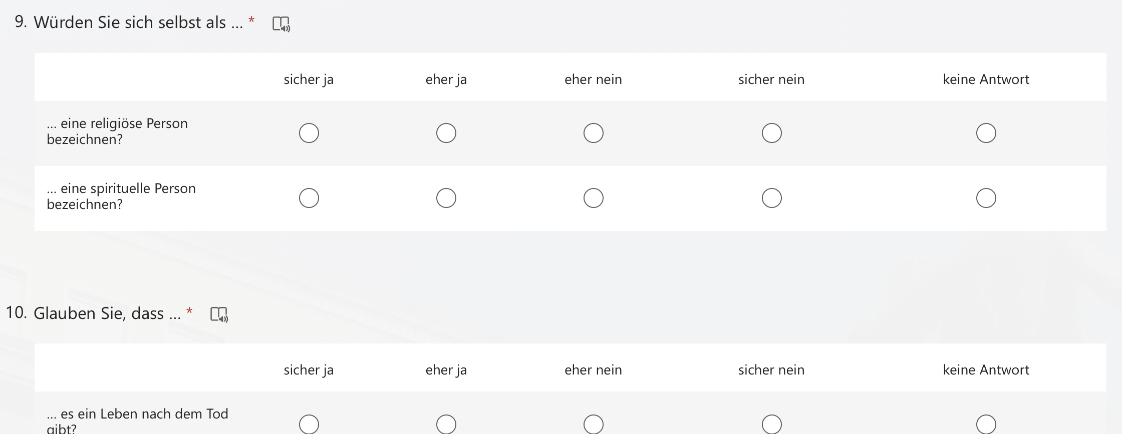 Betreffend der Frage nach Spiritualität antworten von den 313 Teilnehmer*innen der Umfrage 13 Personen "sicher ja", 58 Personen "eher ja", 106 Personen "eher nein", 110 Personen "sicher nein" und 26 "keine Antwort".