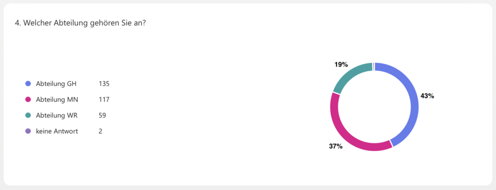 Die Teilnahme der Abteilungen GH, MN und WR ist mit 135, 117 und 59 Personen bzw. 43%, 37% und 19% auffällig insofern, als die tatsächlichen Abteilungsgrössen 43%, 30% und 28% der Schüler*innenschaft ergeben: MN nimmt überproportional teil, WR stark unterproportional. Bei der Teilnahme von insgesamt 21% aller Schüler*innen nehmen aus MN 27% teil, aus WR nur 14%.